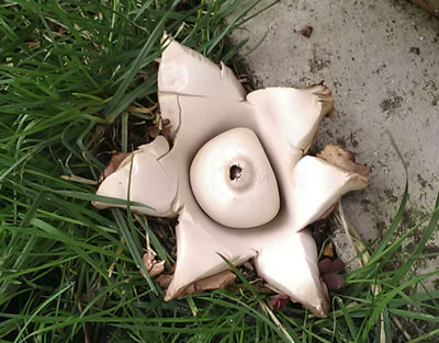 The number of points on the star can vary, but ours had an almost perfect hexameter (6-pointed) form. If it had not been for the adjacent paving stone it would have been entirely symmetrical, too, I should think. This one is actually more correctly termed a 'Collared Earth Star' due to the appearance of being contained by a fleshy border. After a few days it grows out from the centre like a golf ball, and then a hole appears through which the spores puff out and drift away in the wind.