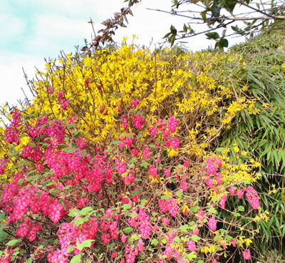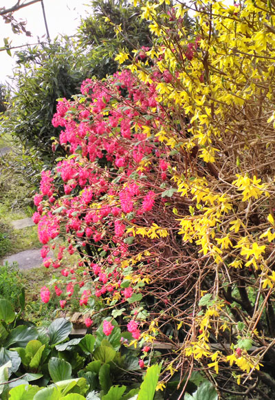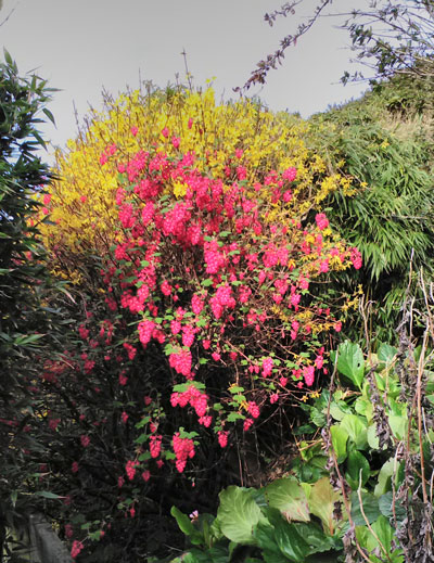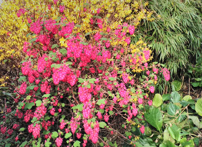 Flowering Currant (Ribes sanguineum ) is, as you can see, a vibrant shrub, deciduous, with clusters of pendulous dark-red florets. It comes from woods and rocky areas in North America, being introduced into the UK in 1817 where it has become a popular favourite in parks and gardens.